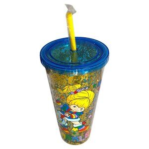 Bring some nostalgic sparkle to your day with this Rainbow Brite & Twink 32oz tumbler! Featuring a vibrant 1980s-inspired design, this cup is adorned with gold glitter and colorful artwork of Rainbow Brite and her fluffy companion, Twink. The holographic "SPARKLE" text adds extra charm, making it a fun collectible for fans. Made from durable plastic, this tumbler includes a secure blue lid and a reusable yellow straw, perfect for beverages.