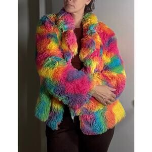 Soft & fluffy rainbow camo faux fur jacket with shawl collar and open front. No pockets. Lined. No flaws. Measures 24” armpit to armpit, 26.5” length.