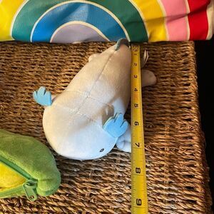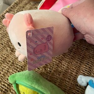 Items my granddaughter has had at my house. The bag has never been used it’s so cute! All plushes are new with the exception of the hamburger doesn’t have its tag. Clean home. Not played with. Super cute lot of great things!! The pea pod with three smiling peas! The axololtl plushes are so sweet. 4-6 inches long. The bag is adorable! Rainbow print.
