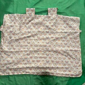 Very cute, trendy rainbow print in warm tones of yellow, orange, red, gray, and brown. The background is a light cream color.