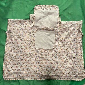 This car seat cover has two elastic bands that fasten to keep the cover from being lifted by the wind. It has the option for a mesh window opening, a full opening, or fully covered. It uses both velcro and plastic button attachments.