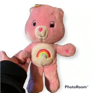 Rainbow Care Bear that’s pink with a rainbow on the front of bear