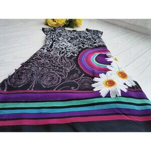 Rainbow Daisy Flower Black Dress Lined Boho Midi Short Sleeve M