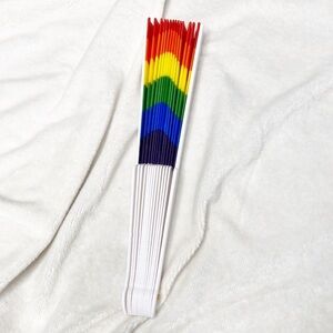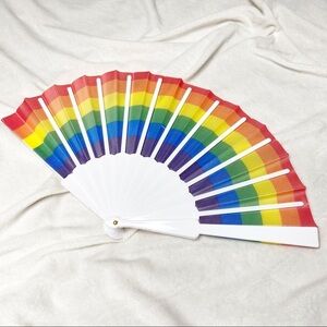 Stay cool and show your pride all year round with this handheld fan! White plastic trim unfolds to a gorgeous and vibrant rainbow cloth fan! Please note, due to manufacturing, plastic may have scuffs on them.