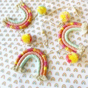 Featuring 3 medium size yarn rainbows in 3 different pastel colors (pink, coral, cream, pistachio & orange ), 4 fluffly pom poms made with pastel multicolors and wooden beads details.