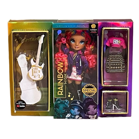 The Rainbow Guitar Special Edition Rainbow High Rockstars CARMEN MAJOR Fashion Doll is a 10-inch dolls with a unique character, Carmen Major. This collectible toy features wavy, curly, long pink hair, blue eyes, and a medium complexion. It comes with a guitar, accessories, outfit, and is part of the Rainbow High franchise by MGA Entertainment. This special edition doll is a must-have for fans of fashion and beauty themes, making it a popular choice for children aged 4 years and up.