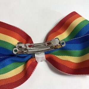 - Bright six color rainbow ribbon with white accent ribbon, 5" across on a 2" French barrette