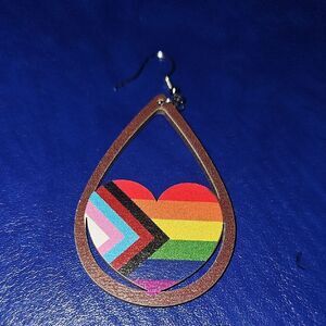 Vibrant teardrop earrings featuring a rainbow heart design. Perfect for adding a pop of color to any outfit.