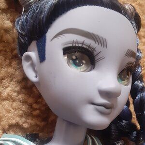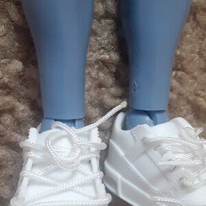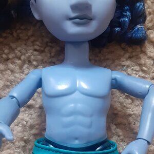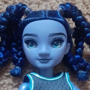 This is a used doll but in decent shape. Camera light varies the images. He has 6 braids and a fade shade on the sides and back. The fade shade is a soft fuzzy material. A little faded black smudge on the cheek. On his articulated arms and one leg, there looks like a circle dent. He comes with his basketball and glasses, don't know where his other stuff is at. Only comes with the doll and his two accessories. Has long eye lashes and glass eyes. He's fully articulated and posable (Including the ankle). Let me know if you have any questions! Color: Blue