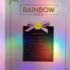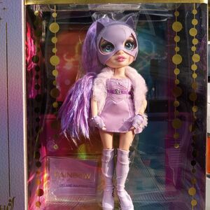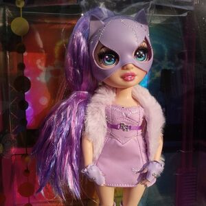 KITTY CAT COSTUME THEMED: Violet Willow is no stranger to juicy gossip. Its like her catnip she just cant stay away. Shes sure her next big story will come from the Rainbow Vision Costume Ball. Shes wearing her purple molded cat mask that ties in the back with satin ribbon straps. And she has her a faux fur white stole, purple cat gloves with sparkling rhinestones and purple tall boots. GORGEOUS FEATURES: Violet Willow is dressed in PURPLE from head to toe. She has gorgeous, detailed features in her fashion, beautiful long purple ponytail, long eye lashes and glass eyes. Collect all the gorgeous Rainbow High & Shadow High Costume Ball themed fashion dolls. TRENDSETTER FASHIONS: Because shes always in the spotlight, Violet is always dressed to impress in her glam, luxe style. She comes with a faux fur stole, show stopping purple boots and a gorgeous purple leather dress with decorative embroidery stitching, sparkling crystals and a RH belt buckle. POSE HER ON DOLL STAND: She's fully articulated and posable, her arms and legs bend for so many glamourous poses.