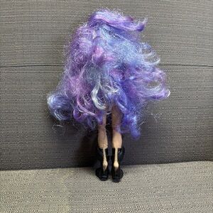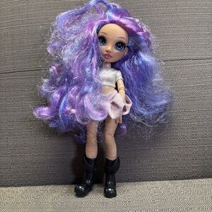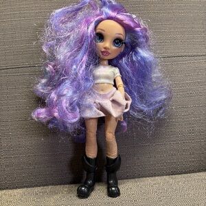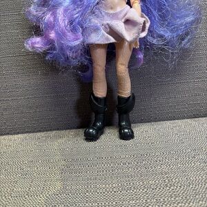 This stylish doll features vibrant purple hair and chic black boots, perfect for imaginative play.