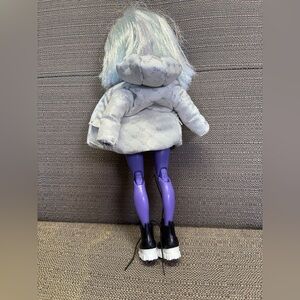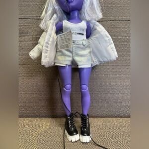 Stylish purple doll with striking white hair. Comes with a chic white outfit and black shoes.