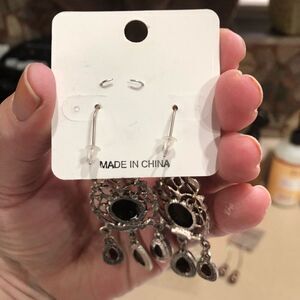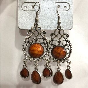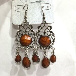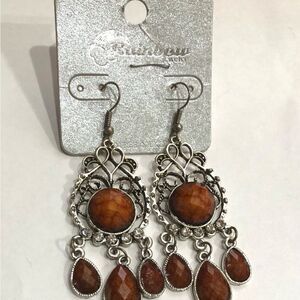 Add a touch of elegance to your outfit with these stunning Rainbow Jewelry teardrop chandelier earrings. The earrings feature a beautiful round shape with brown plastic stones and silver-plated metal. The earrings are designed with a hook closure for easy wear and are 2.5 inches in length.