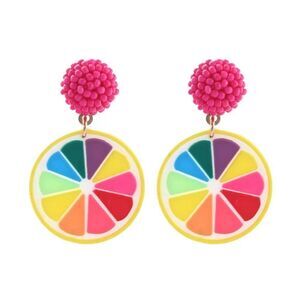 Rainbow Lemon Slice Pink Beaded Dangle Earrings