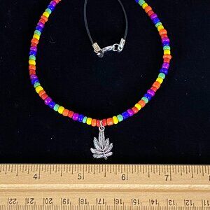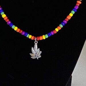 It's 4:20 somewhere! Whether you use marijuana for medicinal purposes or recreation, this necklace shows your love for this amazing plant. Many people associate the "pot" leaf with advocacy and social change. Additionally, for some, the leaf means personal liberties, the belief in a better day and the hope of a brighter world. The rainbow of beads shows your pride and appreciation of Cannabis. This choker measures @ 17 inches and fastens with a lobster claw clasp.
