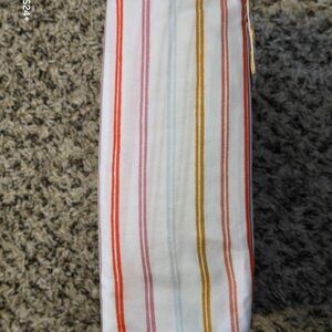 Colorful striped print on white base lends a cheerful look