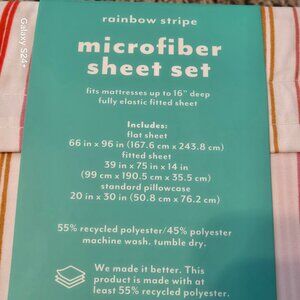 Add a stunning, timeless look to your kiddo's room with the Rainbow Microfiber Striped Sheet Set from Pillowfort™. Made of a brushed, lightweight microfiber fabric, this printed bedsheet set is decked out in a rainbow striped pattern against a white backdrop that brings a dash of cheerful flair to their room. Perfect for year-round use, this vibrant striped sheet set comes with a fitted sheet, flat sheet and matching pillowcase(s) for a complete look. The fully elastic fitted sheet is suitable for mattresses up to 16 inches deep to ensure a snug, secure fit and create a smooth, soft surface for your child to lie on. Machine-washable for easy care and cleaning, this colorful bedding set is perfect for everyday use — add a solid or printed coverlet or comforter, and complete the look with vibrant rainbow- and sun-shaped stuffed pillow buddies.