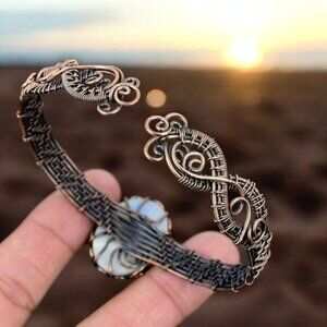 Infused w/ mystical energy, this hand‑crafted rainbow moonstone cuff bracelet features a genuine oval moonstone ✦ intricate copper wire wrap ✦ adjustable open cuff design ✦ above 10g weight ✦ artisan craftsmanship.