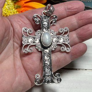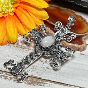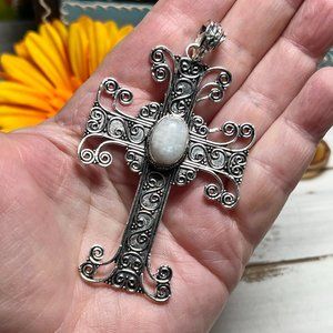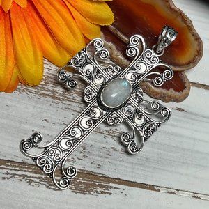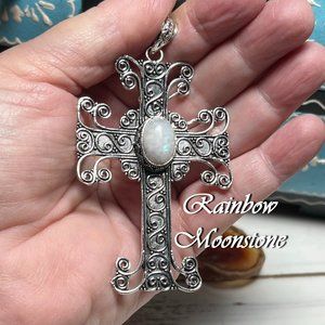 Rainbow Moonstone Cross Pendant Handmade Gemstone Crystal Silver Overlay Large