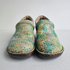 Leather upper in a rainbow floral mosaic pattern w/ mottled watercolor look throughout. Also looks like a snakeskin reptile print w/ subtle gloss in places. Shades of green, blue, red/orange, yellow. Slip on style, round toe, chunky platform clogs base w/ faux woodgrain finish. Issues noted in photos. Very good preowned condition, overall. US Size 8, EU 39 by Born Boc line.
