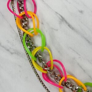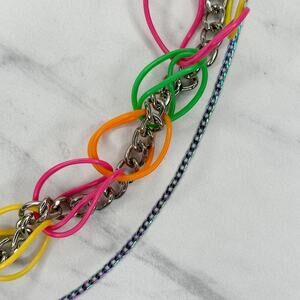 So fun! Chunky multi-strand chain with rainbow rubber rings alternating with metal chain links. Major statement piece!