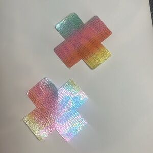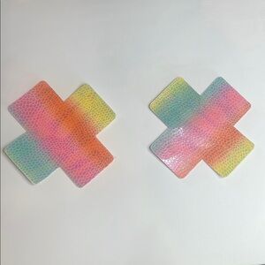 Colorful rainbow pasties with a textured pattern. Perfect for adding a fun touch to any outfit.