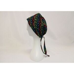 Handmade black cotton print scrub cap. Features rainbow pawprints. Washable and reusable, so it is environmentally friendly.
