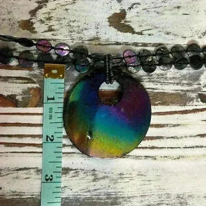 Lightweight statement necklace with rainbow beads and main pendant. The circle pendant is approximately 2.5 inches and the total chain length is 18 inches. One flaw on main pendant -see pictures.