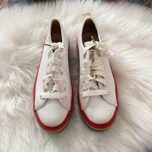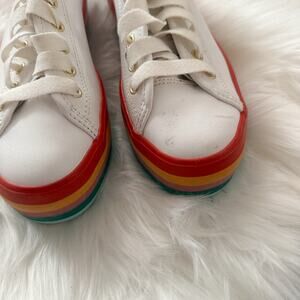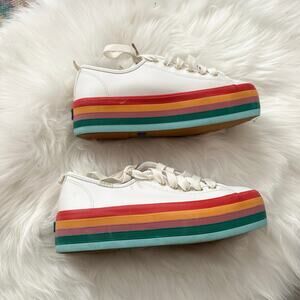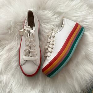Pair of lace-up white/multi-colored rainbow striped Keds platform sneakers. In great condition! Very minimal scuffs - pictured. Only worn a few times.