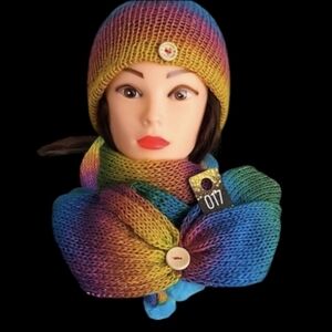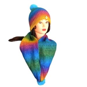 Rainbow Pom Pom Beanie and Scarf 2pc Set Handmade Boho Winter Knit Gift for Her