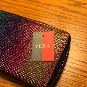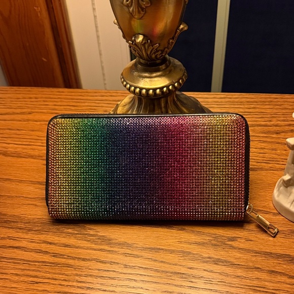 Stunning wallet with rainbow rhinestones. Features a zip closure and elegant design.