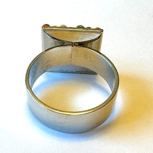 EUC. This fashion ring has rainbow-colored crystals. You'll notice some light wear to the silver finish, but overall it's in nice pre-owned condition. It is approx. US size 8 and is not adjustable; please see the photo with the ring mandrel. This ring is not attracted by a magnet and is lightweight.