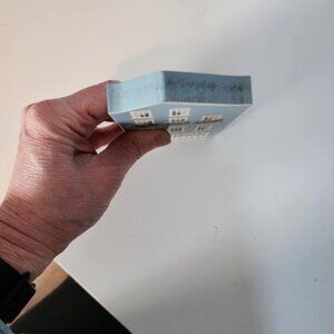 House is light blue. There are tiny scratches and wear marks on it - but it does not detract from the piece from a distance.