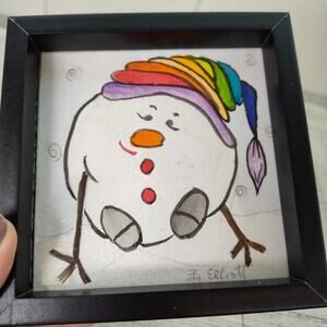 Rainbow Snowball Snowman Handmade Watercolor Art in Black Frame 4.5" Square Table or Wall