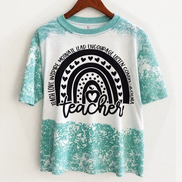 Bleach dye graphic tee in sublimated Rainbow Teacher design