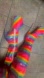 Vibrant rainbow thigh-high platform boots with a striking design. Features a bold zipper detail.