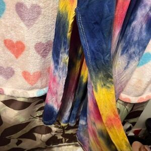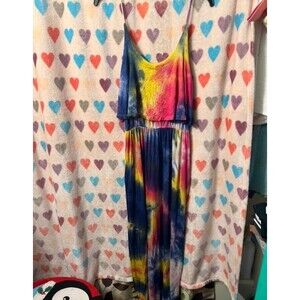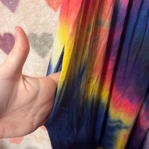Rainbow tie dye print all over. Full length. Elastic at waist. Ruffle layer at top. Spaghetti straps. Has side pockets. Small split on sides. Soft comfy material