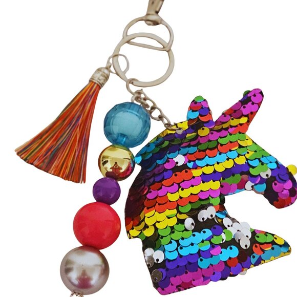 Bright, bold, and full of magic—this rainbow unicorn keychain is made to stand out! The unicorn charm sparkles with multicolored sequins that catch the light from every angle, creating a dazzling effect. It’s accented with a playful mix of oversized beads in blue, gold, purple, coral, and pearl tones, giving it a fun and vibrant personality. A matching rainbow tassel ties the look together with flair. Finished with a sturdy silver-tone clasp and keyring, this piece easily attaches to keys, handbags, or backpacks. Perfect for unicorn lovers, dreamers, and anyone who loves colorful accessories that shine with joy.