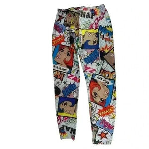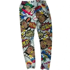 These Rainbow legging pants feature a multicolor comic art pattern and are designed for unisex adults. Made from comfortable and stretchy material, they include an elastic waistband for a snug fit. Suitable for lounging at home or casual sleepwear. Pre-owned condition.