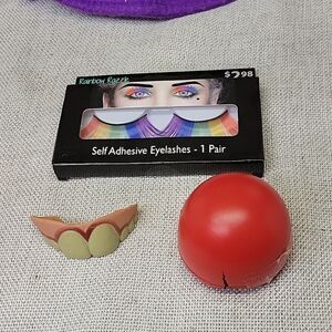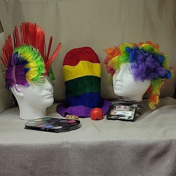 A great assortment of clown accessories to complete your Halloween costume. Included are 2 wigs..a Mohawk and curly clown wig. The is a colorful hat and rainbow eyelashes. And of course a red nose and teeth.