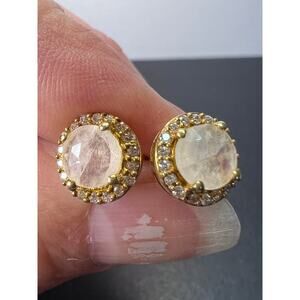 Rainbow moonstones set in 14k yellow gold plated over sterling silver in a halo setting. White accent stones are most likely zircon. 925