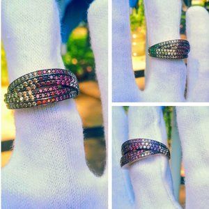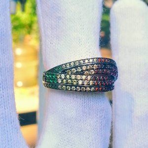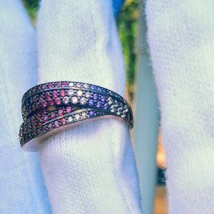 Rainbow of Sparkling CZs rose gold over sterling cross-over band ring sz 6