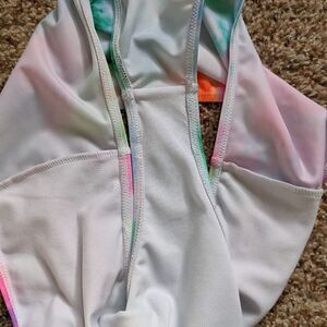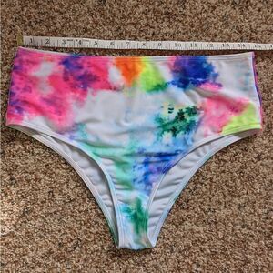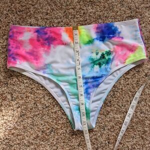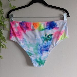 Rainbow Tie Dye Swim Bikini Bottoms. Pink, yellow, green, orange, white. Excellent condition. No signs of wear. No identifying brand or size label. Please see measurements in photos. My best guess is large. Summer, beach, boho. Please let me know if you have any questions. :)