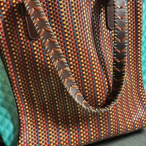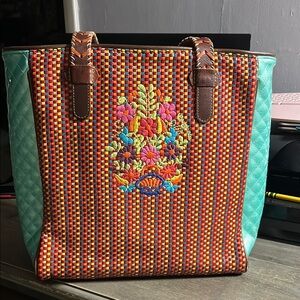 Raw and natural, Consuela's Rainy top-zip shopper combines a rainbow colored woven material and multicolor floral embroidery with iridescent Laguna quilt side panels. Topped with western-inspired soft, brown leather handles with twine stitching, this little lady is lined in Consuela's Big Kitty ConsuelaClotho b print. This compact tote style still offers plenty of room inside where youo bll find a zippered pocket and contrasting Black Dot print slide pocketo bperfect to stash your cell phone and keys.