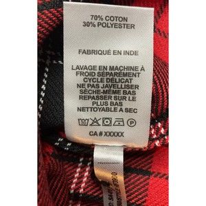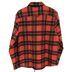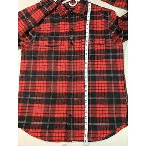 This Rainforest Men's Flannel Shirt is available in black and red plaid, size Large. It is a button-up shirt featuring a collared neckline, pockets, long sleeves, and a heavyweight fabric type perfect for winter, fall, and spring. The shirt is made of a combination of cotton and polyester. The plaid pattern and colorful theme give it an outdoor and rugged feel, making it an ideal addition to any casual button-down shirt collection.