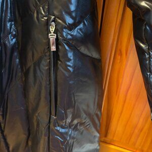 Rainforest down nylon black parka puffer coat size M, lightweight, two front zip pockets, down insulated, two front zip closure, designed for cold weather comfort, measurements in flat waist 18", length 49", sleeves 25", new without tag,