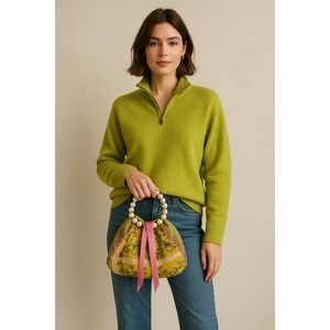 Pair this luxe Rainforest 100% Cashmere Quarter-Zip Sweater in moss green with the NOSHI Los Angeles Gold Floral Embroidered Beaded Pearl Handle Bag (also in my closet). The earthy elegance of cashmere meets the luminous charm of gold beading—giving you an elevated day-to-night look.