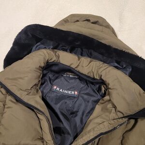 Rainier Goose Down puffer jacket, brownish color, Size 8. Removable hood.