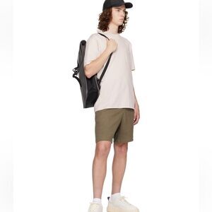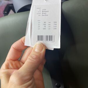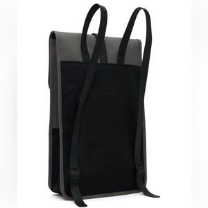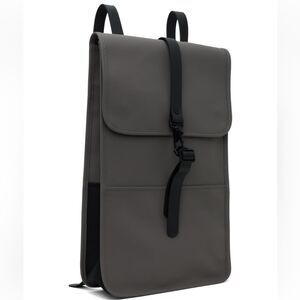 Waterproof polyurethane-coated canvas backpack in gray. · Adjustable shoulder straps · Zip pocket at back face · Foldover flap with lanyard-clasp fastening · Zip pocket and laptop compartment at interior · Fully lined · H20 x W12 x D1.5 in New w tags