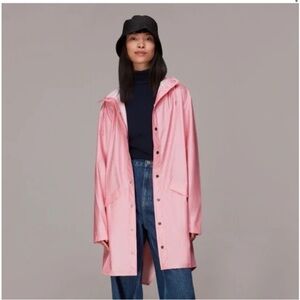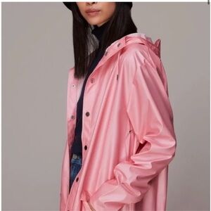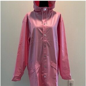 Stylish pink utility jacket by Rains. Features a hood and button closure. Perfect for versatile wear.